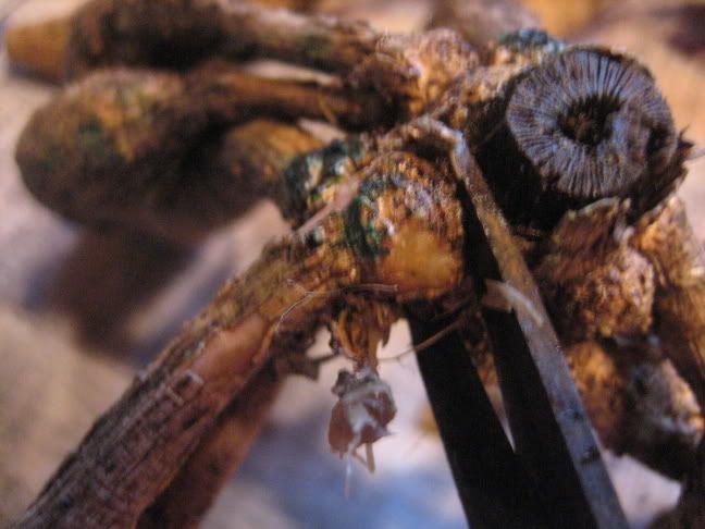 Here's the one next to the base of the stalk, as seen above. It isn't the most desirable tuber, skinny neck and all, but I'm going for it. The little fleshy broken tuber underneath it will be cut out later to get it out of my way.