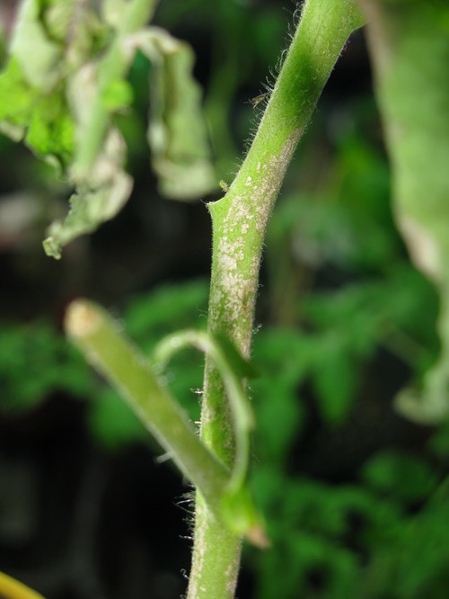 Southern Blight: a fungal disease of stem tissue which first appears as white mold near the soil line or round black spots on the lower stem. Inner and outer stem tissue is affected, and the plant is unable to take up nutrients. Tomatoes outside the South can also contract this disease.