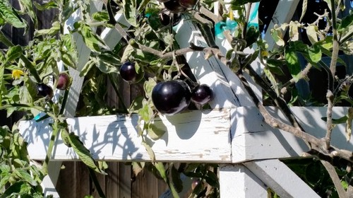 I'm growing Indigo Blue Berries. They are so prolific! All six are doing something interesting ... putting out fresh green leaves like June. Wait for it, they do turn red and taste good. When you remove the stem the tomato has a star on top, red on black.