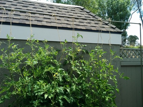john - very nice! i'm using a similar trellis set up - strings dropped from conduit frame, though mine isn't as tall - will your plants hit the top and if so what will you do? top them or let them drape back down?
