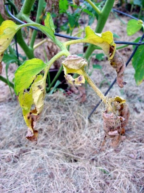 Looks like Bacterial Speck to me. All that infected/spotted foliage needs to be removed from the plant and start spraying all the plant with a good fungicide. If you are overhead watering you need to stop. If it is heavy rains that caused it about all you can do is try to keep ahead of it.