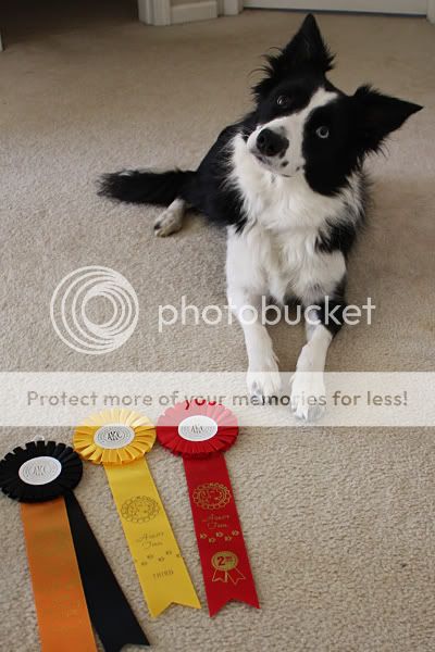 And I always have to put up some photos of little Eluane! She won her title ribbon (the Black Ribbon) in Jumpers into the Advanced Professional level, lol! We still are in Open however for Standard, but the next time we trial in January 2012, we hope to ace and move into another new title so everyone keep your fingers crossed for us! Boxo, Eluane finally got her first 2nd Place rosette she usually gets first place rosettes. Carol, I botched up. Eluane had the fastest time for the route, and should have gotten a 1st place but I screwed up and gave the wrong verbal command so she had a runby and had to recollect, and because the other dogs had no errors we dropped down from 1st to 3rd place, but I'm still pretty happy. I always think it's a Lord-Blessed miracle whenever we get a placement rosette, anyway! Last photo is typical of Border Collies, they love tilting their head back and forth, trying so hard to understand what you're trying to say to them...