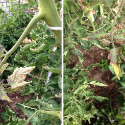 We washed all the soil off of the damaged tomatoes and repotted in potting soil. They really didn't improve but the new plants in potting soil are fine.