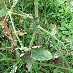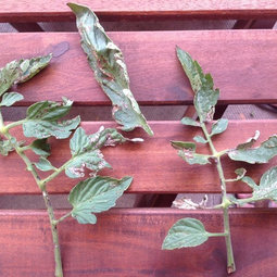 I did forget to mention in the OP that it is a variety of types, both hybrid and heirloom. There does not seem to be any difference in affected plants. The worst off are a Lemon Boy VFN and a Neves Azorean. I grew from seed. This is the third year for the plot, and we have been adding compost yearly. No issues with the toms in the past. I am using burlap for mulch, in a single layer, and base water by hand, so no soil splashing up. My pair of tomatillos and eggplant have not been affected, and there is also shallots, leeks, corn, beets, and parsnips in.