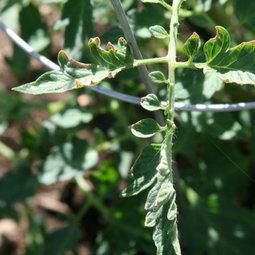 Don't be quick to remove a leaf from a tomato plant that's looking like it's short of leaves, just because the leaf has a hole in it. It isn't a beautiful leaf thing, it's an edible fruit thing. Like sunlight, the plants need all the leaves they can get.