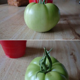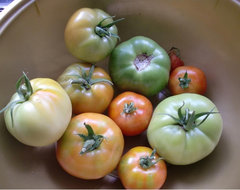 I was wondering if I should pick them, in light of people saying that there's no point in leaving them on the vine to ripen as they will ripen just as well on my kitchen counter. (This was something I learned here). I was going to leave them just a little longer, but then I spotted a bunny INSIDE my raised veggie garden with a little fence to keep the dogs out! Buns ran off when he saw me and had no problem squeezing under the green plastic fencing on the other side... I think I'd better grab those maters while I still can!