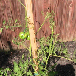 As for the stakes they are the 1 inch 6 footers (rubber green around the metal). I have a few more but when it get's the final landing spot, I will ad probably 2 more. Out of the 4 in containers I have 3 also in ground (1 (4th of july), 1 more ramapo & Black Krim) and behind them where it gets more light later in the summer I just added 2 Kellogg Beafstakes in 16 gal rubermaid containers..not shown here in the pic).