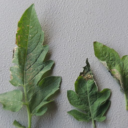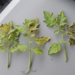 I took a couple of plants in to state lab today (1 Brandywine still in a pot had similar scorching/wilting, a CP has some scorching on margins of top leaves) and plant pathologist thought it was atypical of a virus, thought the BW (and most likely the Rose) was mechanical damage, like petiole had been pinched (possible, since I took them to market on Wed) and the CP he thought could be simple sunburn though it's possible herbicide drift so I just have to keep an eye on all my plants.