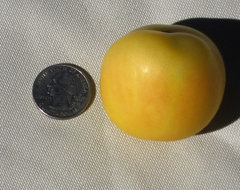 Ping Pong ball size, light yellow 2 oz. fruit with a slight peach blush and fuzz. plant is about 6' tall & quite prolific.