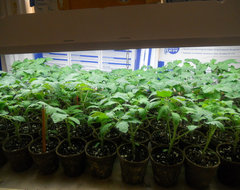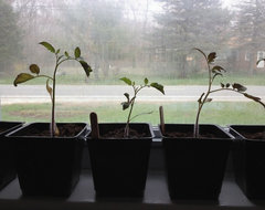 By late May, however, when they've been in the ground for a bit, they'll take off and catch up. And yes, they're probably a little sturdier than the ones started inside. My brother starts his in a hot house and they're usually far bigger than mine when it's time to plant out. But last year we got our first ripe tomatoes in the same week.
