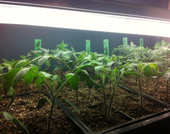 I would have to scrap the three single lights I have to buy double lights. Not sure it is worth it, but I might consider it for next year. As the plants grow they do sometimes touch the lights, esp. when they are growing fast. I haven't had any burn yet, but I like to keep them just a tiny bit above the plant. I plant deep during the first transplant and the leggyness is gone unless planting is delayed from the weather and then they can get a little leggy again. I then plant them deep at planting time. I will have to consider if it is worth replacing these lights that are only 1-2 yrs old right now.