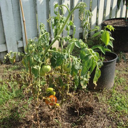 You must also be talking to someone else, because no one on this thread said it was sick with a virus or bacteria, and that you should pull it. If it's been alive for 1.5 years as you say, leaves don't live forever and some yellowing, even dying can be expected. I say it's not sick because yes, you pulled a few yellowing leaves, but the plant I see in the picture has leaves that look good, and if it's been alive for a year and a half you must be doing something right. I'm just wondering how come it didn't grow all last year if it's getting full sun. Are you using potting mix or potting soil? I asked about pot size, because it's kind of hard to tell by the picture. I'm assuming that it looks about 5 gallons which should be big enough. All I can think of is that you might have used potting soil and have some perched water in the pot which might be stunting the growth. I use a skewer to tell if my containers need water. I insert the skewer about 12" down and remove it to see if the bottom of the pot is wet or dry. You also might considering posting this on the "container" forum and see what answers you get. Other than that all I can suggest is waiting and see if the fruit develops. What kind of tomato plant is it? Where is Adelaide? Must be in Southern Hemisphere somewhere.
