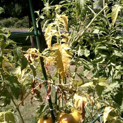 If it's a foliage disease I'm just noting that there are no varieties, hybrid or OP, that are tolerant of the common foliage diseases, but I don't see any spots on the leaves that would indicate that so please do note if you see any such leaf spots and if so please describe as to size and color and shape and if there are any yellow halos around them. Also if there are any dark colored areas on the stems.