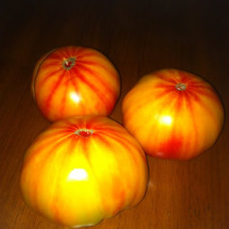 there a very meaty tomato, with kind of a sweet taste to me. Been saving seed from all these monsters. they have a very pretty color. I'm also growing Eva purple, Brandywine, Mortage lifter and sun gold cherry.
