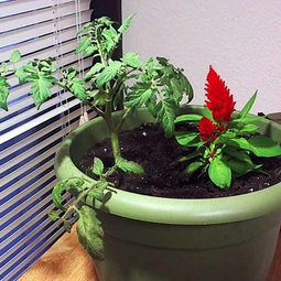 I transplanted the tomato plant into a much larger pot since putting it in the ground isn't an option at this point. Here's a picture:
