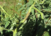 (The virus has a very wide host range from which it can be transmitted in a persistent manner by thrips.Although the virus is acquired at the larval stage it is only spread by the adults which are wind-borne to tomatoes from infected weeds or ornamental plants. Usually there is very little spread WITHIN a tomato crop.)