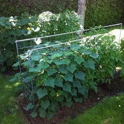 Actually when 5' is used as base, (with a 6" overlap) you can make a cage with over 17" diameter. Then if I make them 7ft tall , each cage will cost me about $9 plus all the struggling with bending, tying. Another MINUS of cage is winter storage.