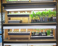 If I were to construct the light stand new, I would use two 2-bulb fixtures separated by several inches. The single 4-bulb fixtures are narrow and don't illuminate a whole 2'x4' shelf as well as I would like.