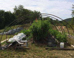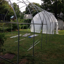 I won't be leaving this up during the winter either. if we get strong winds (this summer kept having warnings but never saw any), the tunnel has about 1/2 mile to the south to go before it hits my uncle's house. I'm hoping it wouldn't clear the knob of ledge with the apple trees right at that end of it though, or the CRW fence around the main garden on the other side of the knob, or the blackberry hill the other side of that, or the stone wall and trees on the property line, or my uncle's pond ;-)
