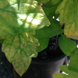Edema (or Oedema) on tomato plants is a physiological condition caused by an imbalance of the plant's water uptake and water loss. It develops when the plants roots absorb water at a faster rate than it is transpired through the leaf cells. The enlarged leaf cells divide, and then rupture. This rupturing of the leaf epidermis and inner cells causes the raised blisters and distortion of the foliage.